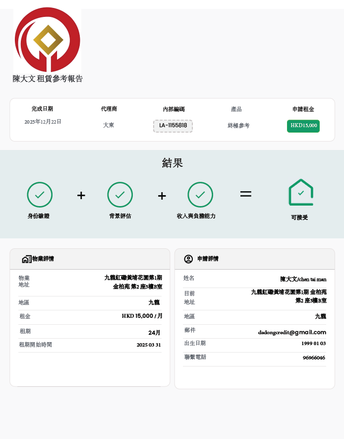 大東信貸為香港業主提供「準租客信用與背景審查報告」,結合信貸評分、入息及就業核實、過往租務紀錄等多項指標,協助業主在簽約前全面評估準租客風險。hkp+1Zu-Ke-Xin-Yong-Yu-Bei-Jing-He-Cha-Bao-Gao-Zi-Zhi-Mo-Ban.docx